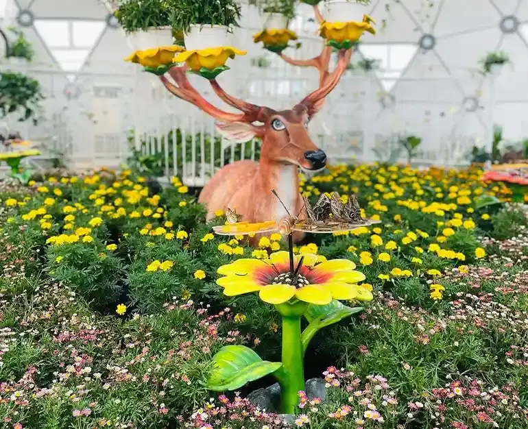 - باغهای گل: در اطراف تالار پروانه مجموعهای گیاهان و گلهای متنوع و رنگارنگ وجود دارند که پروانهها در این محیط پرواز میکنند و از این گلها تغذیه میکنند.