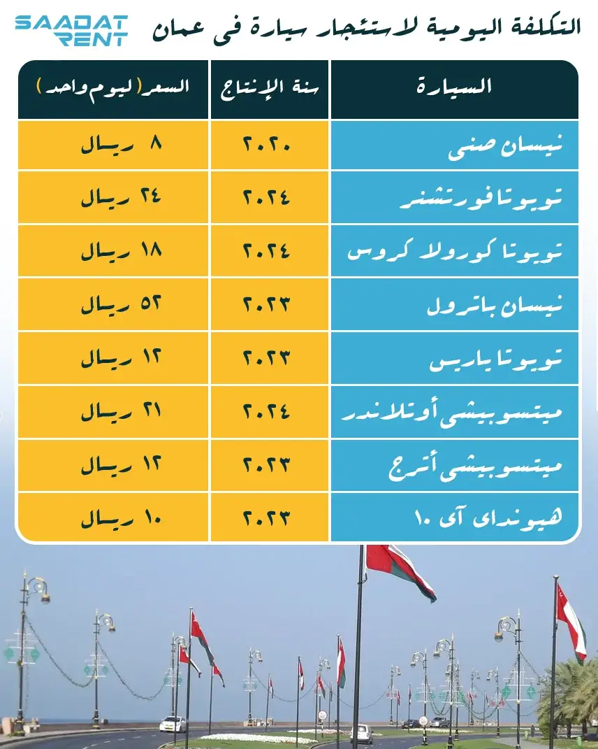 قائمة أسعار تأجير السيارات في مسقط، عمان