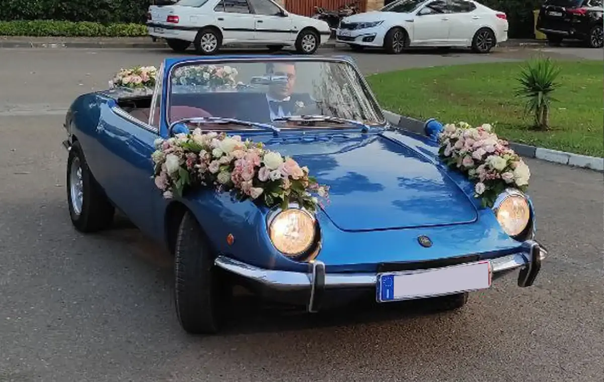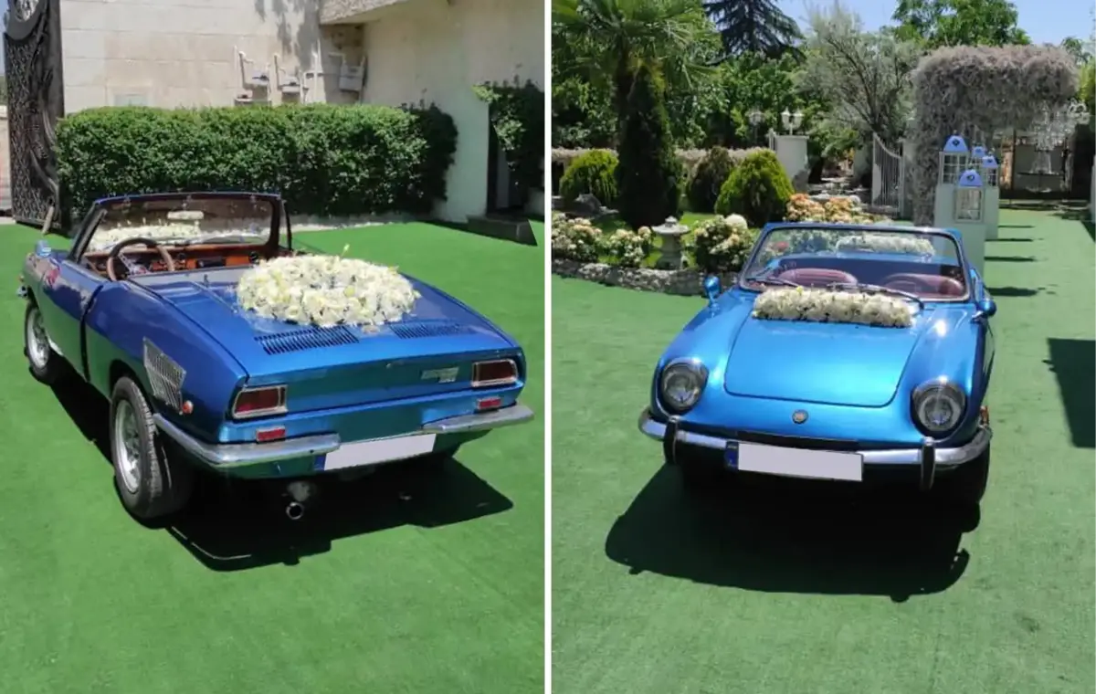 ماشین عروس کلاسیک فیات اسپایدر تنها در رنگ آبی برای اجاره موجود است.