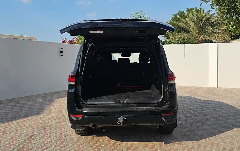 صندوق عقب تویوتا لندکروزر ظرفیت قرار دادن ۵ چمدان بزرگ را دارد. با حجم تقریبی ۴۵۳ لیتر در حالت استفاده از هر سه ردیف صندلی، این خودرو برای سفرهای خانوادگی و حمل بارهای بزرگ کاملاً مناسب است. در صورت خواباندن صندلیهای ردیف سوم، فضای بیشتری برای ۸ تا ۱۰ چمدان متوسط یا چمدانهای بزرگتر فراهم میشود. این خودرو انتخابی عالی برای سفرهای طولانی و خانوادگی است.