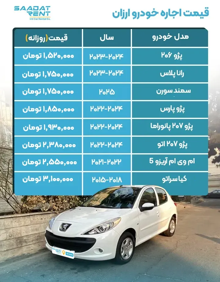 با مراجعه به سایت و لیست خودروهای سعادت رنت، میتوانید با پرداخت هزینهای معقول و منطقی، نسبت به کرایه ماشین به صورت بدون راننده با حداقل زمان 3 روز اقدام کنید.