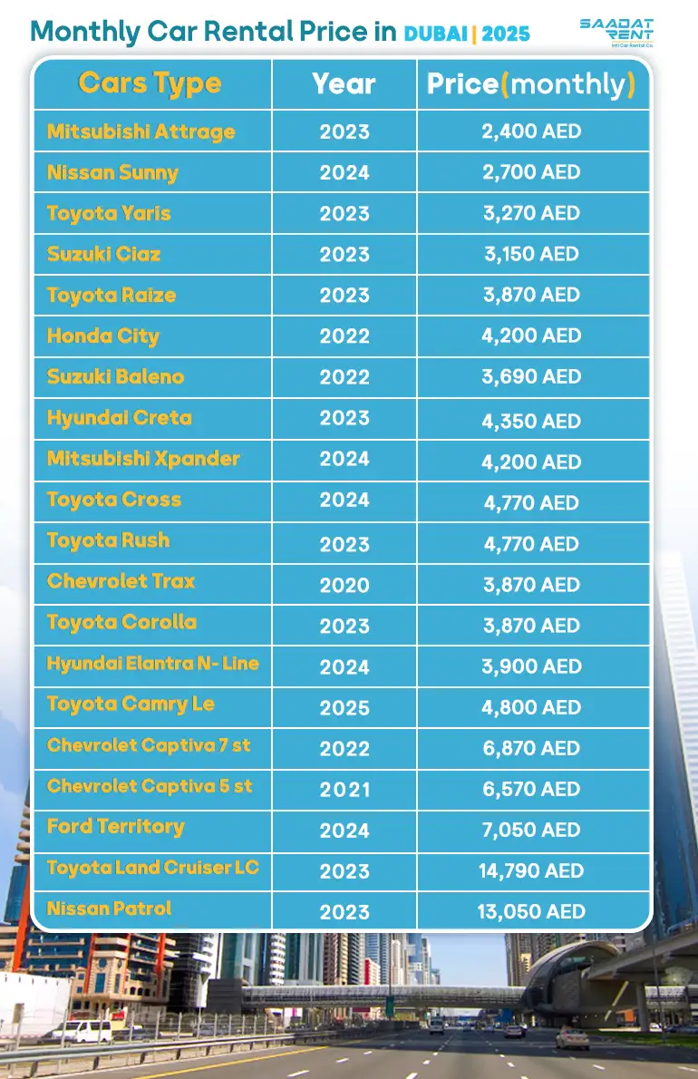 - Long-term car rental in Dubai has a lot of benefits. One of the most important benefits of long-term car rental Dubai is cost-effectiveness. If you want to rent a car in Dubai monthly, SAADATRENT offers a wide range of vehicles with reasonable prices.