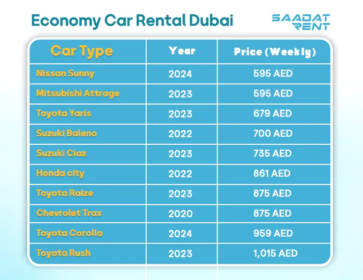 - Budget-friendly Cars: Saadat Rent offers a range of economy and fuel-efficient rental cars in Dubai that are suitable for those who are searching for budget travel itineraries. Nissan Sunny, Mitsubishi Attrage, Toyota Yaris, Suzuki Baleno, etc are Saadat Rent's economy cars in Dubai.