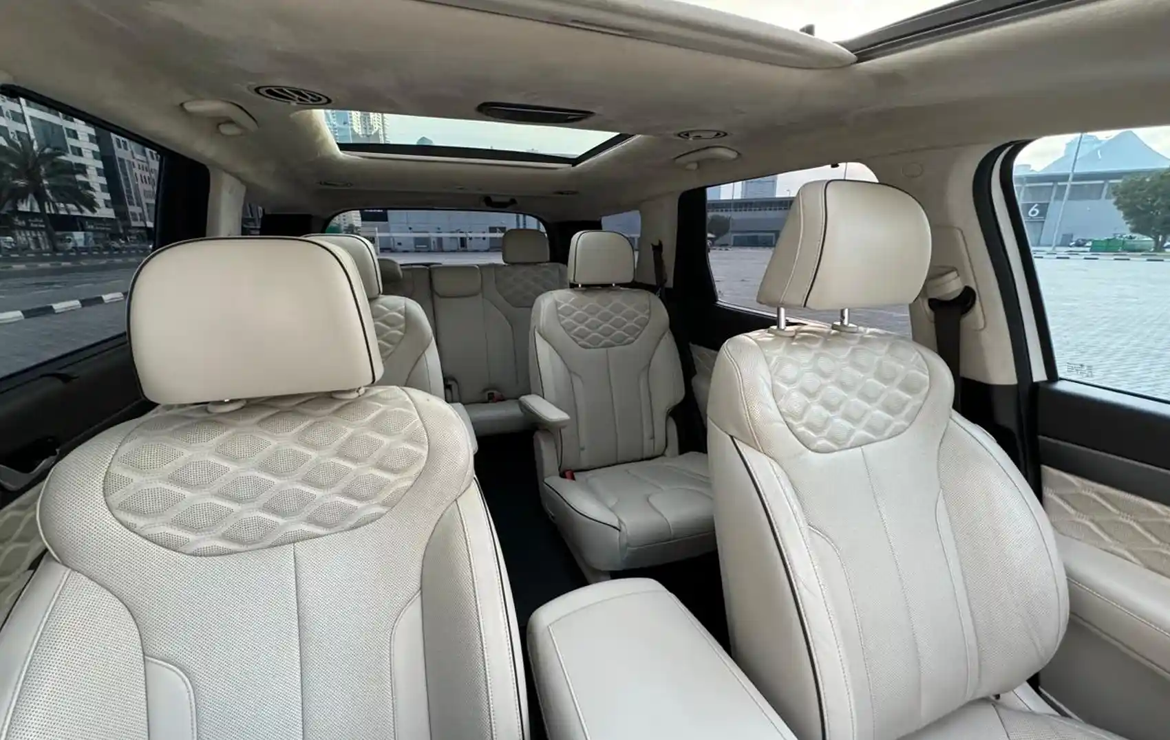 Hyundai Palisade rental in Kish offers exceptional cargo capacity for a full-size SUV. With 509 liters of trunk space behind the third row, it provides ample room for family trips, business travel, or outdoor adventures. The spacious cargo area can comfortably fit 3 to 4 large (28-32 inches) suitcases or 5 to 6 medium-sized (24-26 inches) suitcases. For even greater storage, folding down the rear seats expands the capacity to 2,447 liters, making it an ideal choice for those who need both premium comfort and maximum versatility.