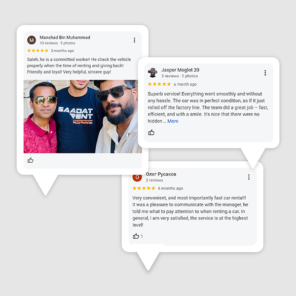 Saadatrent provides basic insurance with all rentals, covering third-party liability and theft. You can also choose to upgrade to additional coverage for added peace of mind.