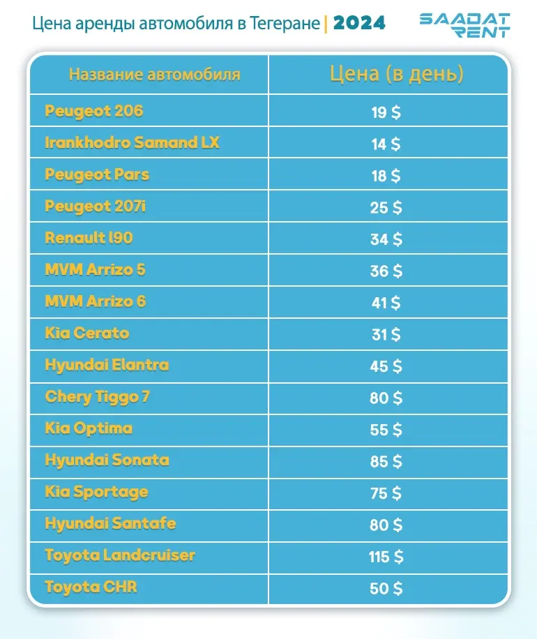 Цены на аренду автомобилей в Тегеране варьируются в зависимости от сезона и типа автомобиля. Аренда полубюджетных автомобилей начинается от 1687.86 российских рублей в день, а аренда люксовых автомобилей может достигать 10549.12 российских рублей в день. Все автомобили Saadat Rent модели 2016-2024 годов.