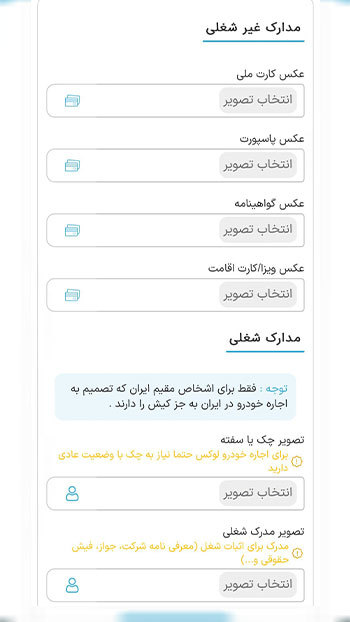 - ودیعه نقدی (دیپوزیت) یا چک به مبلغ تعیینشده (بسته به خودروی انتخابی متفاوت است و از ۸ میلیون تومان شروع میشود.)