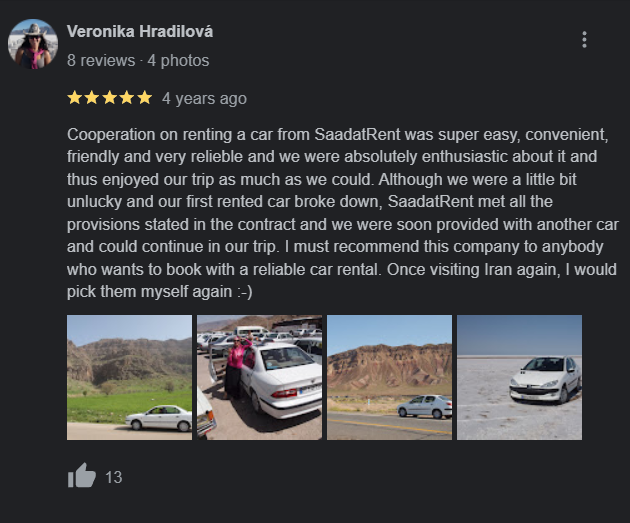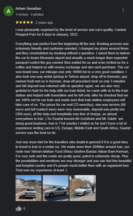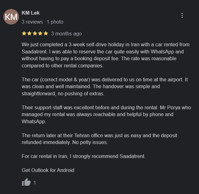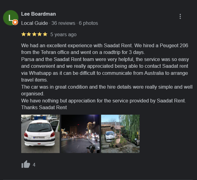 Welcome to our comprehensive guide on car rentals in Tehran! Whether you’re a tourist ready to explore or a local seeking convenience, our blog delves into real customer reviews and experiences from platforms like Tripadvisor, Trustpilot, and Google Review. Discover heartfelt stories and practical tips that will help you confidently navigate the rental process and transform your travels into unforgettable adventures with Saadatrent. Let’s embark on this journey together!