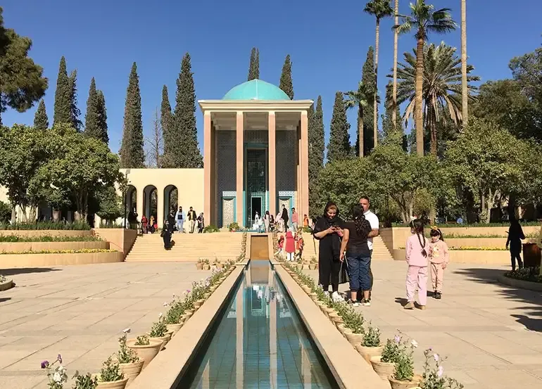 در میانه حیاط، آرامگاه هشتضلعی با گنبدی فیروزهای و ستونهای سنگی بلند قرار دارد که مقبره حافظ را در بر گرفته و اطراف آن باغی سرسبز و پر از گلهای رنگارنگ است. حافظیه نهتنها محلی برای علاقهمندان شعر و ادب فارسی است، بلکه بهدلیل فضای آرام و معنویاش، یکی از پربازدیدترین مکانهای ایران محسوب میشود.