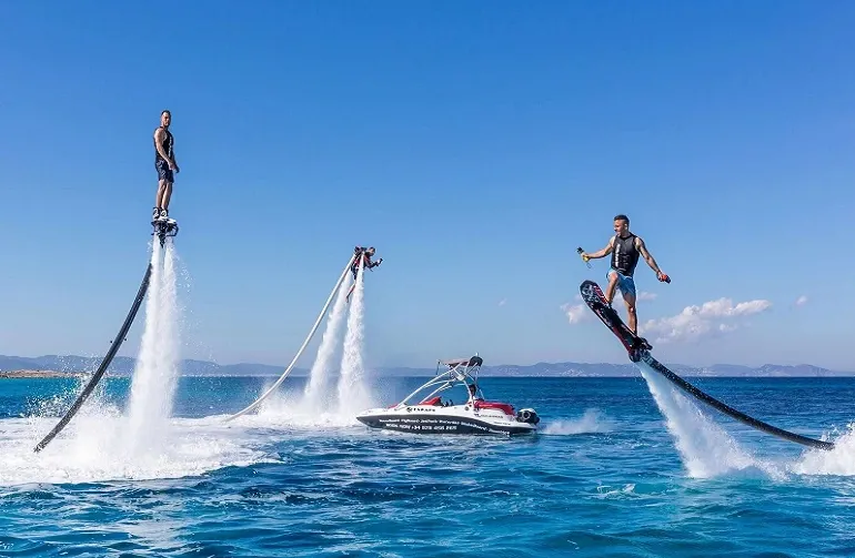 فلای بورد در جزیره یکی از جذابترین تفریحات آبی کیش است که برای دوستداران ورزشهای ماجراجویانه و هیجانی ارائه میشود. در این ورزش بر روی یک تخته متصل به شلنگهای فشار قوی آب ایستاده و با فشار آب به بالا پرتاب میشوید. فلای بورد برای طرفداران فعالیتهای آبی و ورزشکاران جزو یکی از بهترین تفریح های آبی است.