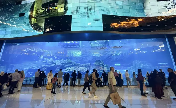 آکواریوم دبی مال یکی از بزرگترین آکواریومهای سرپوشیده جهان است که بیش از ۱۴۰ گونه مختلف دریایی از جمله کوسهها، سفرهماهیها و ماهیان کمیاب را در خود جای داده است. این مخزن غولپیکر بیش از ۱۰ میلیون لیتر آب دارد و تونل شیشهای ۴۸ متری آن، تجربهای منحصربهفرد از تماشای دنیای زیر آب را ارائه میدهد. در بخش باغوحش زیر آب نیز میتوانید از نزدیک با تمساحهای عظیم، پنگوئنها و جانوران دریایی نادر آشنا شوید.