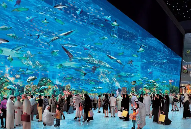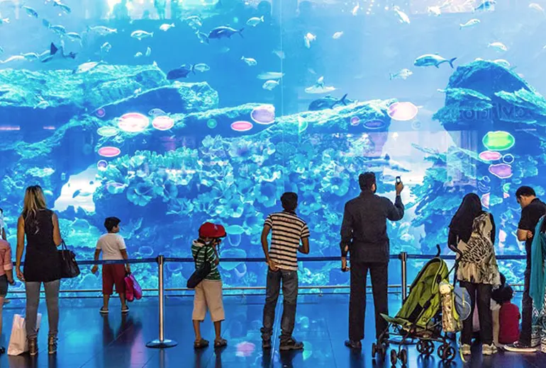 در قلب دبی مال، یکی از مشهورترین و بزرگترین آکواریومهای دبی و جهان قرار گرفته که بیشک جزو برجستهترین جاهای دیدنی دبی محسوب میشود. آکواریوم دبی و باغوحش زیر آب با بیش از ۱۴۰ گونه دریایی، یک دنیای زیرآبی شگفتانگیز را پیش روی شما میگذارد.