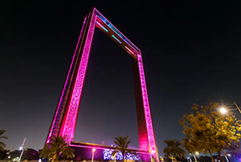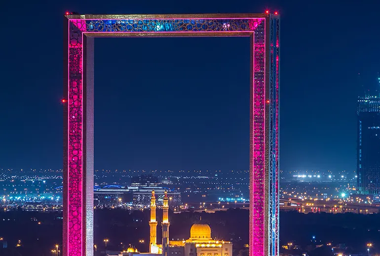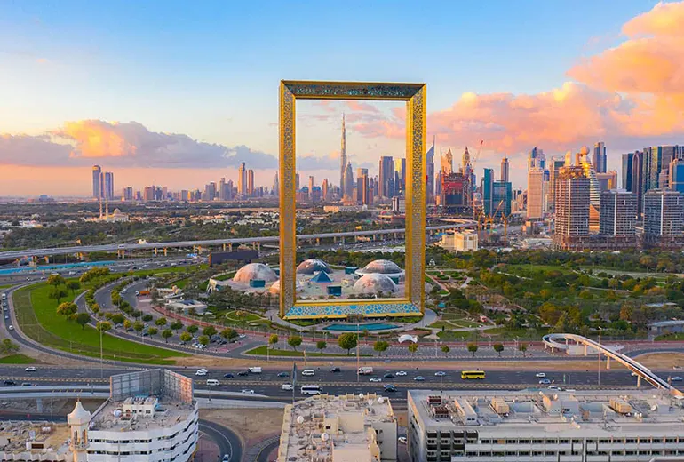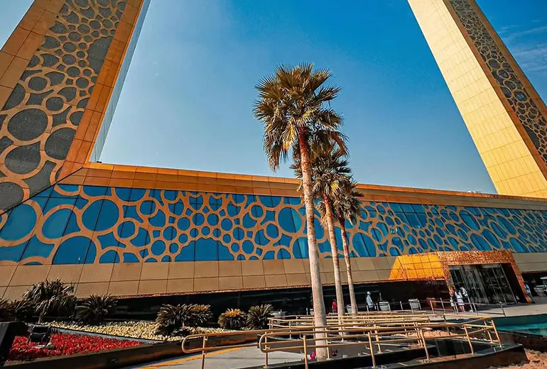 یکی از نمادهای مدرن در لیست جاهای دیدنی دبی، بدون شک قاب دبی (Dubai Frame) است. این سازه عظیم با ارتفاع ۱۵۰ متر و عرض ۹۵ متر، فرصتی بینظیر برای تماشای دو چشمانداز متضاد از شهر دبی را فراهم میکند؛ دبی قدیم در یک سو و دبی مدرن در سوی دیگر. با تهیه بلیت میتوانید به سکوی شیشهای بالای قاب بروید و نمایی ۳۶۰ درجه از شهر را تجربه کنید. همچنین صرف صبحانه در رستوران قاب دبی، تجربهای فراموشنشدنی در میان مکان های دیدنی دبی خواهد بود.