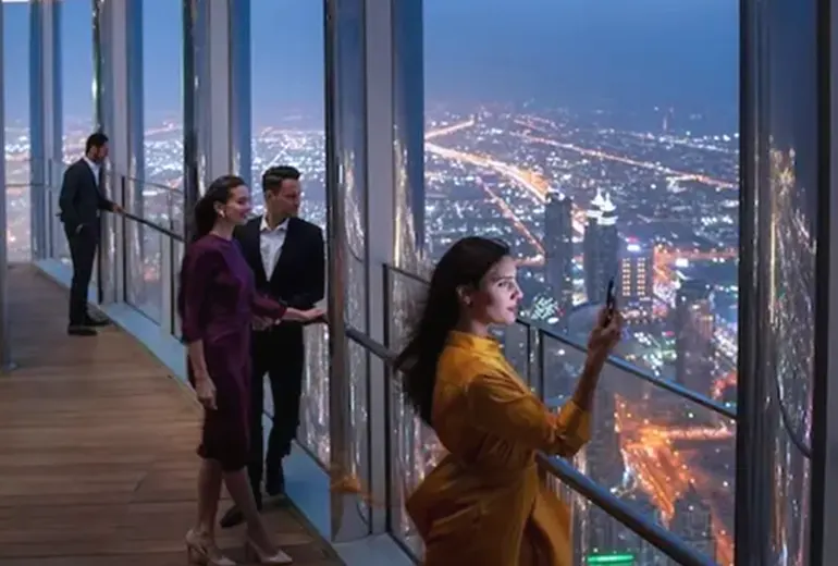 آسانسور شیشهای فوقسریع این برج با سرعتی حدود ۱۰ متر در ثانیه، شما را در چند لحظه به سکوی بازدید در ارتفاعی باورنکردنی میبرد؛ جایی که دبی زیر پایتان گسترده میشود. از بالای برج، منظره تماشایی آبنمای دبی و افق مدرن شهر، یکی از زیباترین لحظات گردش در دبی را رقم میزند.