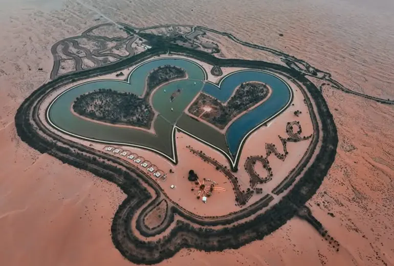در دل بیابانهای العویر، جاذبهای عاشقانه و بینظیر قرار گرفته که به یکی از پربازدیدترین جاهای دیدنی دبی تبدیل شده است. دریاچه عشق دبی، یا Love Lake Dubai، با طراحی دو دریاچه به شکل قلب و محیط سرسبز اطراف، مقصدی رویایی برای عکاسی، گردش خانوادگی و پیکنیکهای رمانتیک است.