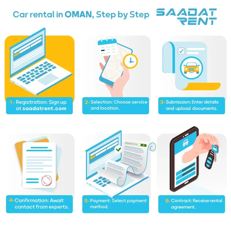1. برای اجاره خودرو در فرودگاه عمان می‌توانید تمامی مراحل را به‌صورت آنلاین و پشتیبانی آنلاین با شعبات سعادت رنت انجام دهید.