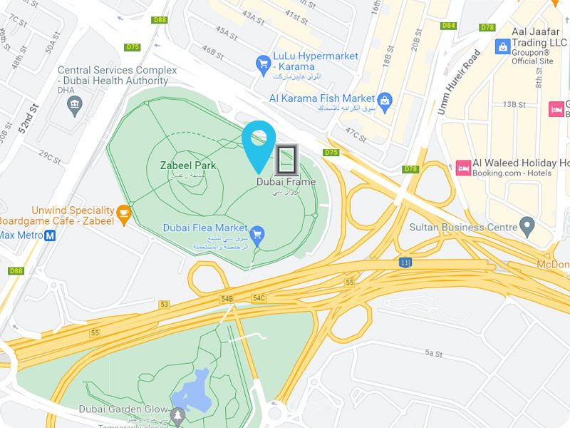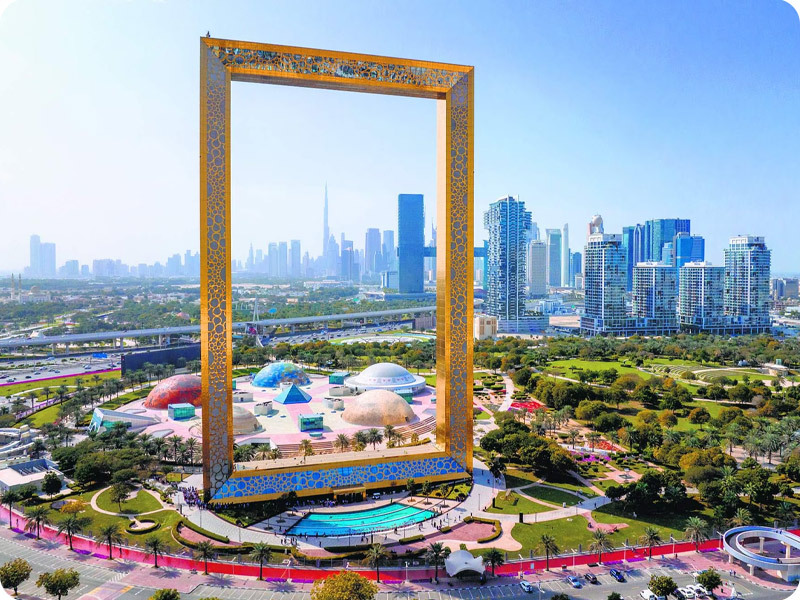 مانند قاب عکس بزرگ ۱۵۰ متری طراحی شده و می‌توان مناظر بی‌نظیری از دبی را مشاهده کرد. بازدیدکنندگان با استفاده از آسانسور به بالای قاب رفته و از پل شیشه‌ای که دو برج را به هم متصل می‌کند، نمای شهر را تماشا کنند. موزه‌ی طبقه پایین تاریخ دبی را به نمایش می‌گذارد.