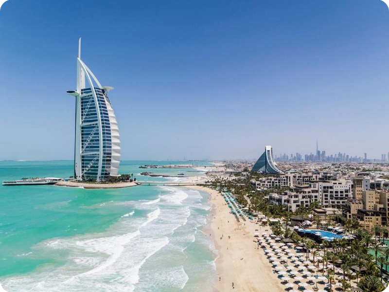 این هتل ۷ ستاره که به شکل یک بادبان طراحی شده و بر روی یک جزیره مصنوعی ساخته شده است که از طریق یک پل خصوصی به ساحل جمیرا متصل می‌شود. برج العرب دارای سوئیت‌های مجلل، رستوران‌های برنده جوایز و امکانات رفاهی است که تجربه‌ی بی‌نظیر برای مهمانان خود فراهم می‌کند.